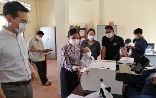 機器の使用方法の研修会も同時に開かれ、パソコンと点字翻訳用のソフトウエアを使い、カンボジア語と点字が同時に印刷できる方法を学んでいました。点字とカンボジア語の同時印刷できる点字プリンターは同国では初めての導入で、先生は「墨字があるので、生徒に勉強を教えやすい」「不足していた教科書をたくさん作れる」「点字ディスプレイは初めての体験だが、学習を補助する装置として活用したい」などと話しています。日本テレソフトでは引き続き機材のメンテナンスも含め協力を続けることにしています。